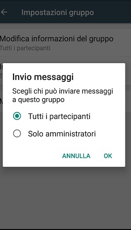 Su "Impostazioni gruppo" in qualità di amministratore potrai scegliere chi può inviare messaggi all'interno della chat cliccando su Tutti i partecipanti o su Solo amministratori, in questo caso a pubblicare informazioni o altri contenuti sarai solo tu impedendo così a chiunque di scrivere o di aggiungere commenti all'interno della chat.
